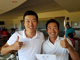 前週同じTGCで長谷川に圧勝した権藤はこの日金渕と対戦。金渕からもハンデ3枚をもらえるということでこの日も圧勝かと思われた。ところが出だし4ホールで僅かに1ボギーの金渕が終始リード。権藤も必死に喰らいつき、14番・15番で連続アップした権藤がやっと初めてリードを奪った。これで残り3ホール。このまま逃げ切りたいところだったが、16番をお互いボギーで分けると、権藤は17番で8、18番はまさかの11を叩き金渕が上がり2ホールで労せず逆転勝利。前週グロス95の権藤がこの日はまさかの116を叩く別人となり、ダントツ1番人気は2回戦で姿を消した。 |