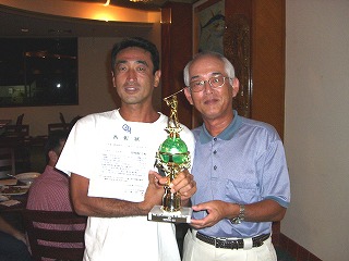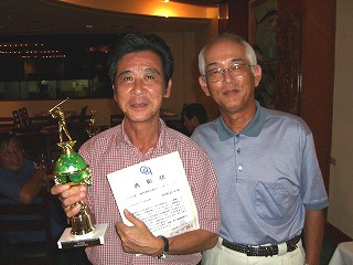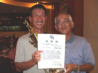 | いよいよ会長の名調子で各賞の発表です | 最多勝 野口会員 なんと優勝6回 | 2年連続ニアピン王 青木会員 |