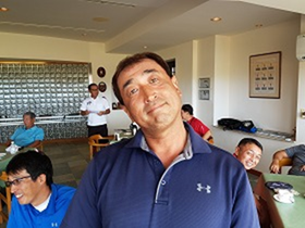 マンギラオで行われた5月の月例会にゲスト1名を含む20名が参加した。4人の満額はいたものの、それ以外の罰金は僅かに3人とマンギラオにしては中々の好成績。3位はグロス79、ネット72の慎太郎。2位はグロス106、ネット70で、優勝資格のない椛沢。優勝したのはネット68の下野。アウトは50を叩いたがインは46で廻ってコース自己ベストのグロス96。昨年入会後4試合目で初優勝、そして2週連続優勝で史上最速5戦目で2勝目を挙げる華々しいデビューから、久しぶりに3勝目を挙げました。 |