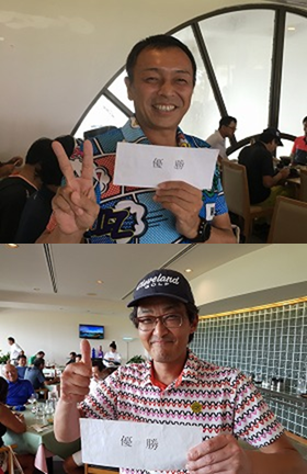 辛いマンギラオ月間を乗り越え、迎えたスターツでの9月初戦。雨天中止も予想される中、16名が集まり無事競技は終了した。2週連続満額罰金だった吉田が、先月なら優勝間違いなしのネット71で4位。自己ベストにあと1打に迫るグロス87、ネット69の関根が3位。自己ベスト74を叩き出し、顔写真を撮られたらどうしようかと心配した拓也がネット65でまさかの2位。果たして優勝したのは、最終ホールで返しの20センチのパットを外しながら、自己ベストを一気に10打縮めるグロス93、ネット61の黒岩が2年ぶりの優勝です。 |