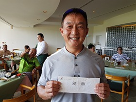 | タロフォフォで行われた11月の月例会に17名が参加し、3日前の11月27日にご逝去された中嶋元会長に黙祷を捧げスタートした。優勝争いとは全く関係ない話だが、金渕・椛沢という社内コンペ組で廻った貴之。6番ホールまではパーが4個と元シングルの腕前を披露したが、7番ホールからは11ホール連続パーなしという苦行が続きたどり着いた最終ホール。残り100ヤードの3打目をピンそばにぴたりとつけてバーディーフィニッシュと思いきや、ボールはそのままカップインし今年2人目、自身2度目のイーグルを奪い7位となった。優勝争いはネット71の3人の争い。前週天敵の徹と廻って見事BBとなった関根はこの日も再び徹と同じ組に。 →下に続く |