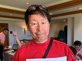 | マンギラオで行われた11月最初の週例会に16名が参加した。いつものことながら、この日罰金を免れたのは僅かに2人。満額は2人でそのうちの1人、4週連続BMを狙った金森は惜しくもBB。しかしこれで9月の優勝直後から5週連続BB/BMとなった。7位は罰金$5の野口、3位は罰金$3の関根。そしてギリギリ罰金を免れたネット77の青木がもしかして優勝?と本人も期待したが2位。ネット75で優勝したのは熊谷。2016・2017年と年間1勝。昨年は未勝利だったが、今年はこれで2勝目。この4年間の4勝全てがマンギラオです。 | 2番人気の椛沢がハンデ28を武器に藤井と対戦。難所の10番から3連続パーと最高のスタートを切った藤井だが、ドライバーを封印した椛沢はスプーンが絶好調。ハンデを生かして藤井にリードを与えず、最後まで相手を苦しめるかと思われた。ところが問題はパター。3パット・4パットを連発しリズムを崩し前半で3ダウン。後半に入ると頼みのスプーンも当たらなくなり、2番のボギーで一つ返すのがやっと。結局3パット4回、4パット2回の×6個で、4&3と予想外の差で藤井が勝利し2年ぶりのベスト4へ。1番人気の権藤はハンデ14を武器に康充と対戦。厩舎を変更し日本から帰ってきたばかりの権藤は前半ボギーが一つしか取れず64の大叩き。前半だけで4ダウンとワンサイドゲームになるかと思われた。 | しかし1番で初めてパーを奪うと2番も連続パー。その後はボギーとダボで粘りを見せると、勝ちを焦った康充が7番でトリ、8番では9を叩きついに1ダウンに迫って最終ホールを迎えた。最後もハンデがあるため、同スコアならカウントバックで逆転勝利となる権藤。康充がパーオンに失敗すると、自分は冷静に3打目をバンカー手前に刻み、4オン2パットのボギーで見事勝利! のはずだったが、4打目はチョロって目の前のバンカーへ。結局ボギー・ダボで追いつけず、康充が1アップで何とか逃げ切り初のベスト4へ駒を進めた。この結果準決勝は初出場の小笹対藤井、そして黒岩対康充となった。 | |||||||||
