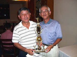 | いよいよ会長の名調子で各賞の発表です | 最多勝 野口会員 なんと優勝6回 | 2年連続ニアピン王 青木会員 |