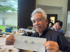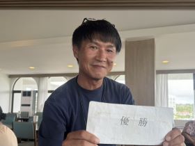 マンギラオで行われた11月第2週の週例会に12名が参加しました。満額3人を含む4位から罰金となる中、ネット77でギリギリ罰金を免れた神野が3位で同ネットの藤井が2位。ネット75で優勝したのは徹会長。16番で4パットし9を叩いて優勝はないかと思われたが、18番でグリーンを飛び出すかと思われた右上からの長いパーパットがピンに当たり見事カップイン。今季2勝目を挙げました。なお3番で行われたドラコンでは柴田が今季2度目のドラコンゲットです。
