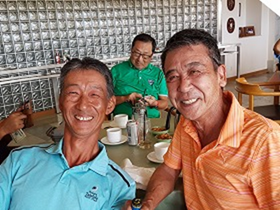 毎年恒例のシニア会との交流会が行われた。昨年に続き今年も会場はレオパレス。対戦成績では過去14勝5敗と圧倒している我が九十九会であるが、レオパレスにおいては過去1勝1敗。その上今年は通常プレーしているティーマークから、つまり九十九会は青または白、シニア会は全員白ティーからという絶対的不利な条件を敢えて飲み、対戦に望んだ。果たしてその結果は、戦前の予想通り平均ネット3.09の差をつけられての敗戦となったが、楽しい交流会であった。 |