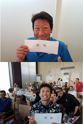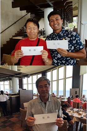 マンギラオ月間最終戦にゲスト1人を含め8月最多の26名が参加した。毎週多くの罰金を集め、罰金を免れるだけで優勝もありえるマンギラオ。この日は「もしかして俺が優勝?」と思った者が多かったに違いない。ところがこの日は7位のネット76に3人、3位のネット75にも3人で野口が3位で月間MVPかと密かに期待したが、同ネット同グロスでインのスコアが良かった貴之が3位。2位はグロス79の慎太郎がネット74で2位&月間MVP。そしてマンギラオ月間を制したのは、3週前に送別コンペをして惜しくも2位だった下野が再び参戦し見事ネット73で優勝。本当の最終戦を有終の美で飾りました。おめでとう! |